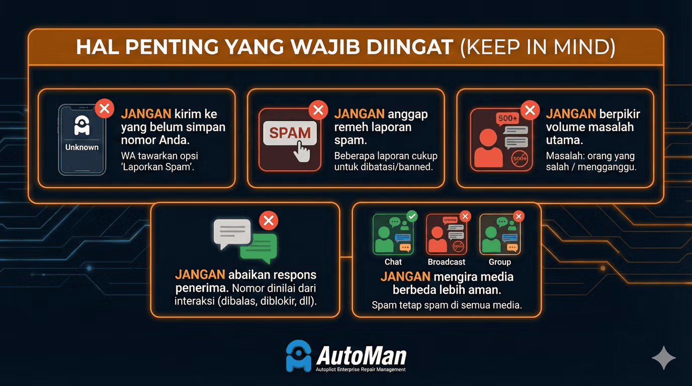 Namun, penting untuk dipahami bahwa WhatsApp memiliki sistem keamanan yang sangat ketat terhadap perilaku spam.